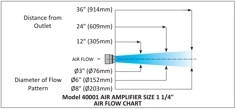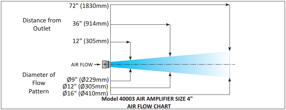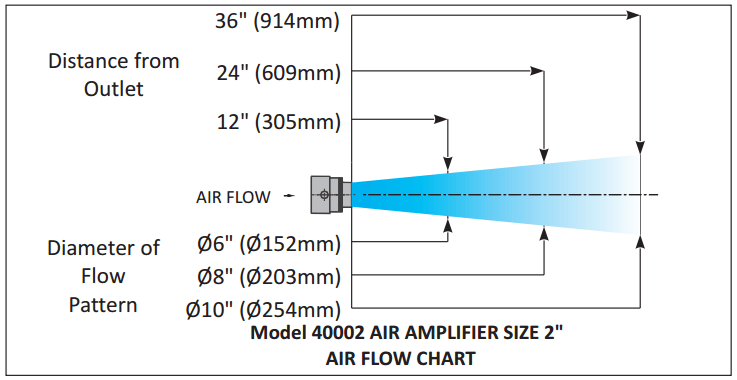 INLET PRESSURE 40000/40000S 40001/40001S 40002/40002S 40003/40003S 20 PSIG 1400 1700 2150 1550 (1.4 BAR) (7.112) (8.636) (10.922) (7.874) 40 PSIG 1600 2600 3200 2300 (2.8 BAR) (8.128) (13.208) (16.256) (11.684) 60 PSIG 2000 3200 3850 2780 (4.1 BAR) (10.16) (16.256) (19.558) (14.1224) 80 PSIG 2200 3650 4450 3100 (5.5 BAR) (11.176) (18.542) (22.606) (15.748) 100 PSIG 2400 3900 4850 3250 (6.9 BAR) (12.192) (19.812) (24.638) (16.51) 120 PSIG 2600 4100 5200 3420 (8.4 BAR) (13.208) (20.828) (26.416) (17.3736) Adjustable Air Amplifier Ducting