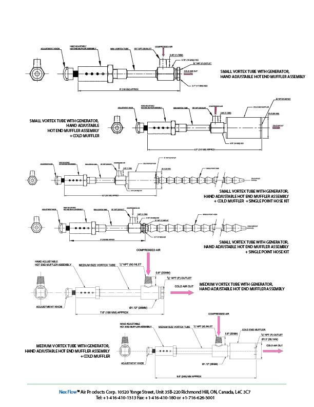 The Frigid-X™ Adjustable Spot Cooler is adjustable in both temperature and flow. The temperature is adjustable using a knob at the hot end to set the temperature precisely to your requirements from approximately minus 30ºF to room temperature. Three precision brass generators come with the system for flow rate adjustment – providing refrigeration from 700btu to 2100 BTU/hr. Nex Flow™ Frigid-X™