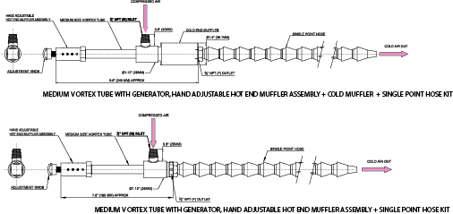 Vortex Tubes normally come with an adjustable hot end that requires screwdriver to change the setting. If the application requires an easier adjusting mechanism the Hand Adjustable version is available. For the small and medium sized vortex tubes. It comes with a built in hot end muffler for noise reduction and is made if stainless steel. The Hand Adjustable assembly may also be purchased separately to convert the standard Vortex Tube into a hand adjustable version. Inside the vortex tube is the interchangeable brass generator which determines the air flow capacity.