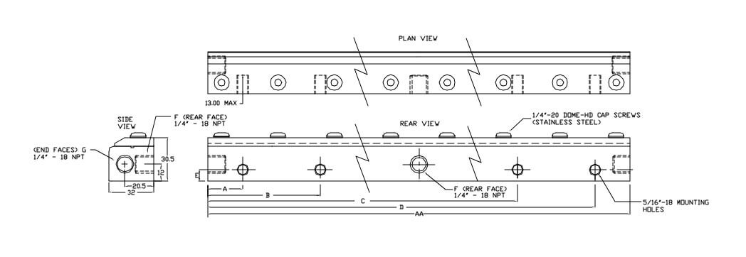 8mm22(Extra Middle mounting hole only on the 36″ Air-Blade™ 457mm from each end)