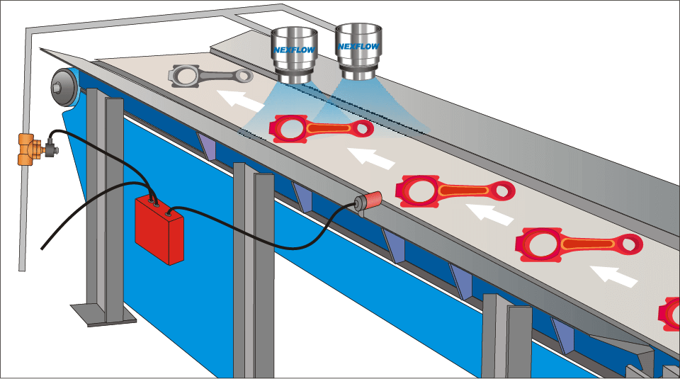 PLCFC APPLICATION – Compressed air use is reduced by 70% utilizing the PLCFC. Two Air Amplifiers used to cool castings only operate when the sensor “SEES” the castings and shuts them off two seconds after the castings are cooled. No timers need to be set. Air Amplifiers cool the castings as they move along a conveyor. The sensor detects the part to turn on the amplifiers. The air turns off after 2 seconds after the castings have passed – an ideal “Plug and Play” solution to save compressed air.
