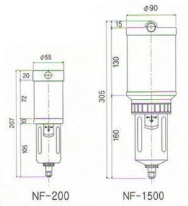 Description NF-200 NF-1500 Max. operation flow rate SCFM(Nl/min) 9 (200) 64 (1500) Max. pressure drop (PSIG) (Mpa) {Kgf/cm2} 3.5 (0-0.025) {0-0.25} Operating pressure range (PSIG) (Mpa) {Kgf/cm2} 140 (0.01-1.0) {1.0-10.2} Max pressure before failure(PSIG) (Mpa) {Kgf/cm2} 172 (1.2) {12.1} Fluid temperature range (°F) (°C) (68 to 140°F) (-20-60°C) Type of drain valve Automatic (can be drained manually) Air line connection diameter (inches) NPT-1/4″ NPT-1/2″ Drain outlet connection diameter (Rc) 1/4 (Ø6.35mm) One touch nipple Type Weight (kg) 0.40 1.10 External Dimensions (mm) Ø55×207 Ø90×305 - + Dimensions