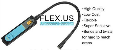 The FLEX.US ultrasonic leak detector kit comes with the FLEX.US unit, carrying case, and manual and utilizes two AA alkaline batteries(included). The FLEX.US is a complete kit – the high quality flexible sensor is mounted on the end of a flexible steel pipe so the ultrasonic sound can access hard to reach areas. The unit converts the ultrasonic noise of a leak into a sound humans can hear (hissing sound) and not just some beeping sound or LED display that may not distinguish a leak sound from other phenomenon.
